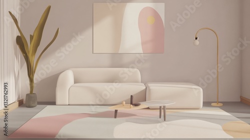 Fototapeta premium Modern Minimalist Living Room Design with Soft Pastel Colors and Abstract Art