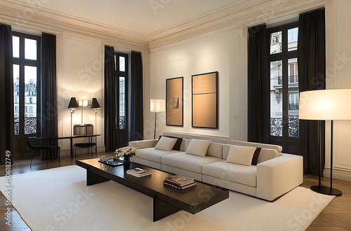 © paper later, Naklejka premium Modern minimalist living room interior design.