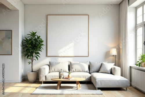 © napak, Fototapeta premium Modern Minimalist Living Room Interior Design Featuring a Large Empty Frame and Comfortable Sectional Sofa