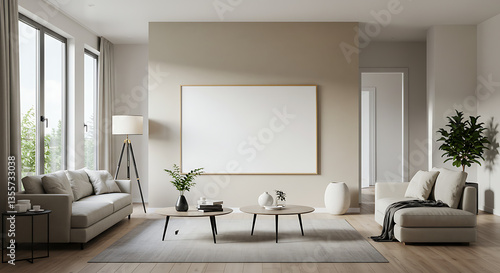 © ABDULELLAH, Fototapeta premium Modern Minimalist Living Room Interior Design with Large Empty Frame Mockup
