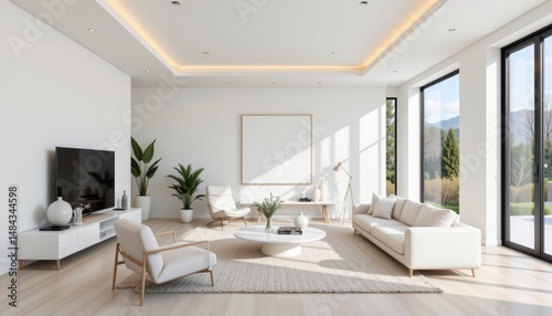 Fototapeta premium Modern minimalist living room interior design with large windows and bright natural light