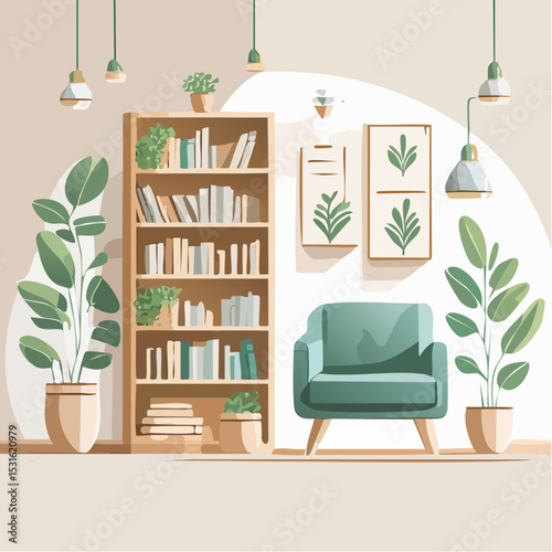 Fototapeta premium Modern Minimalist Living Room Interior with Green Armchair and Bookshelf