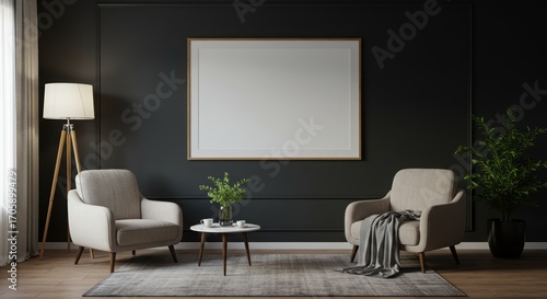 Fototapeta premium Modern minimalist living room interior with two comfortable armchairs a coffee table and plants on dark wall background with framed artwork