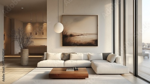 Fototapeta premium Modern minimalist living room, neutral tones, large white sectional sofa, abstract landscape painting, pendant light, floor-to-ceiling windows, wooden coffee table, textured wall, cozy atmosphere, arc
