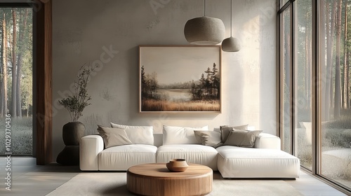 Fototapeta premium Modern minimalist living room, neutral tones, large white sectional sofa, abstract landscape painting, pendant light, floor-to-ceiling windows, wooden coffee table, textured wall, cozy atmosphere, arc