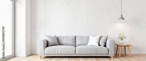 Fototapeta premium Modern minimalist living room with gray sofa and natural light, tranquility