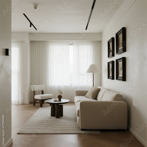Fototapeta premium Modern minimalist living room with white sofa and curtains