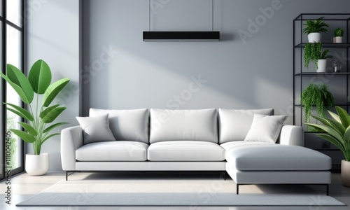 Fototapeta premium Modern minimalist living room with white sofa and greenery accents