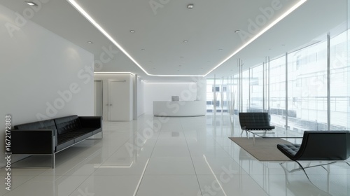 Fototapeta premium Modern minimalist lobby with white glossy floors, black leather sofa, chrome frames, recessed lighting,