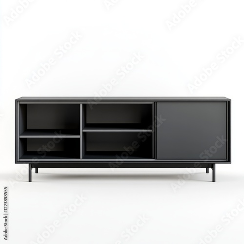 © Adames Art Studio, Fototapeta premium Modern minimalist media cabinet with open shelving and a sliding door.