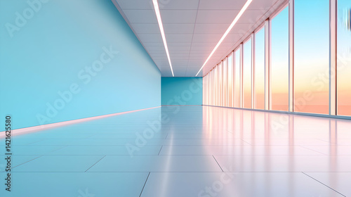 © Zatra, Obraz premium Modern Minimalist Office Corridor with Pastel Blue Walls and Sunset View