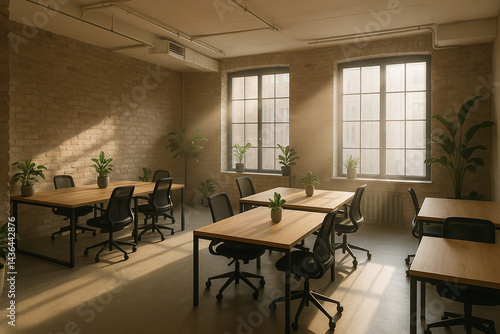 Fototapeta premium Modern minimalist office with organized desks, laptops, and decorative plants