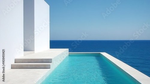 Obraz premium Modern minimalist pool with ocean view and blue sky backdrop