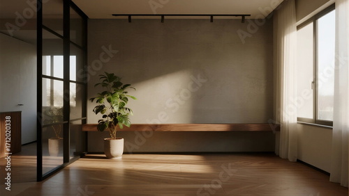 Obraz premium Modern minimalist room with wooden floor and large window