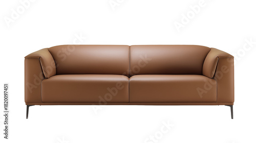 © Matt, Obraz premium Modern minimalist two-seater brown leather sofa with metallic legs on transparent background