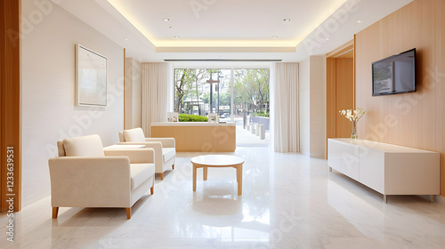 Fototapeta premium Modern minimalist waiting room, bright sunlight, city view, peaceful atmosphere, ideal for healthcare or business