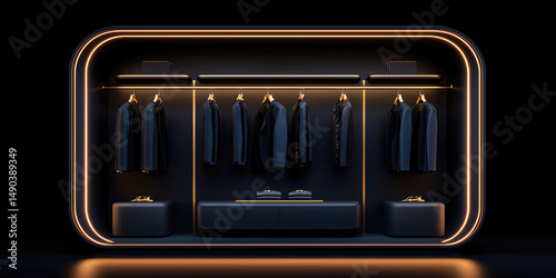 © trustmastertx, Obraz premium Modern minimalist wardrobe with dark suits and gold accents.