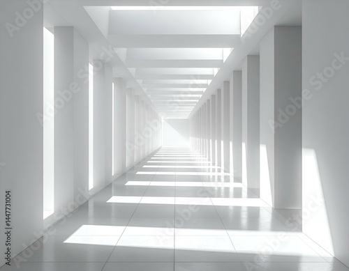 Fototapeta premium Modern minimalist white hallway with natural light streaming through skylights and windows. Clean lines, bright interior. Perfect for architectural or design concepts.
