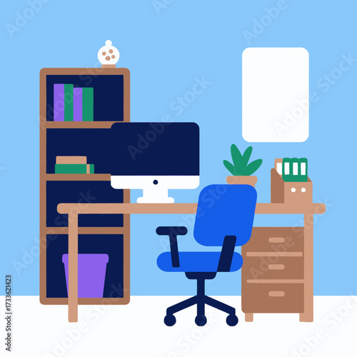 Fototapeta premium Modern minimalist workspace with vibrant blue chair and bookshelf under clear sky