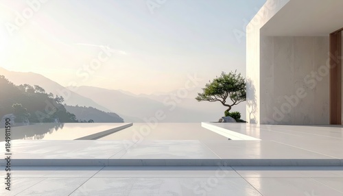© Raitalinn, Obraz premium Modern minimalistic architecture with a mountain view and serene landscaping at sunrise