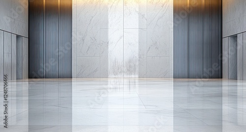 © btiger, Obraz premium Modern Minimalistic Interior with Polished Marble Floor and Brushed Metal Walls
