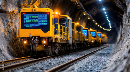Obraz premium Modern mining trains operate in tunnel, showcasing advanced technology and...