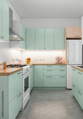 © Rizka, Fototapeta premium Modern mint kitchen with appliances and decor