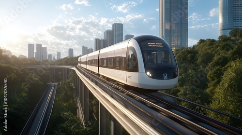 © SlotPoM, Naklejka premium Modern monorail train on elevated track in city.