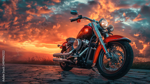© Fxquadro, Obraz premium Modern motorcycle at sunset with dramatic sky