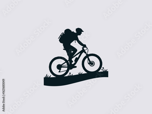© Ani, Obraz premium Modern mountain bike vector logo with tire treads and peak silhouette for extreme sports brand identity