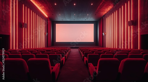 © Hanny, Fototapeta premium Modern movie theater interior with vibrant red lighting.