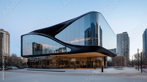 © alex, Fototapeta premium Modern museum with a twisted steel and glass facade, reflecting the city. AI generated