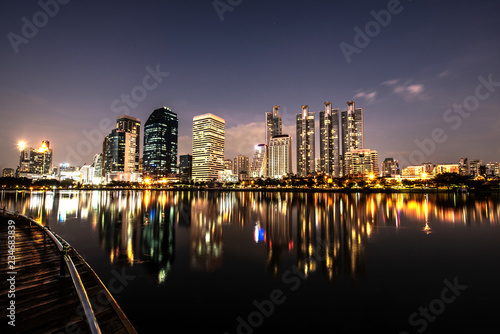 © somchaichoosiri, Fototapeta premium Modern night city skyline with lights reflection