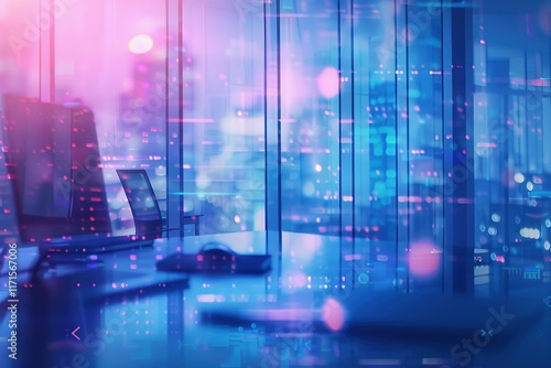 © Rayhanbp, Fototapeta premium Modern office at night, city view. Desk with computers.