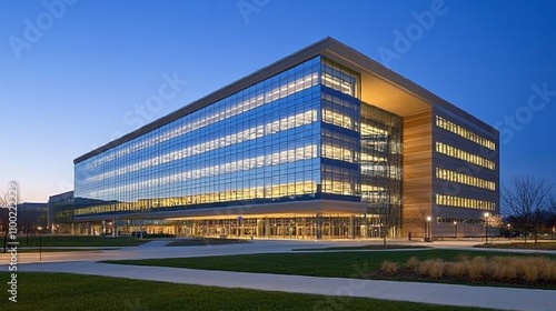 © phattharabodin, Fototapeta premium Modern Office Building at Dusk with Illuminated Windows
