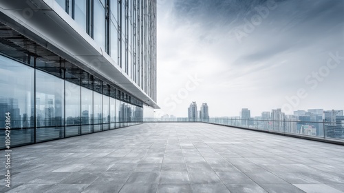 © The Little Hut, Obraz premium Modern Office Building Exterior with City Skyline and Glass Facade on Overcast Day
