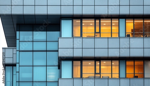 Fototapeta premium Modern Office Building Facade with Windows and Illuminated Interior
