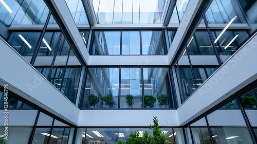 Obraz premium Modern office building interior showcasing large glass windows and green...