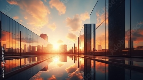 © pinkrabbit, Obraz premium Modern office building or business center. High-rise window buildings made of glass reflect the clouds and the sunset. empty street outside wall modernity civilization. growing up business