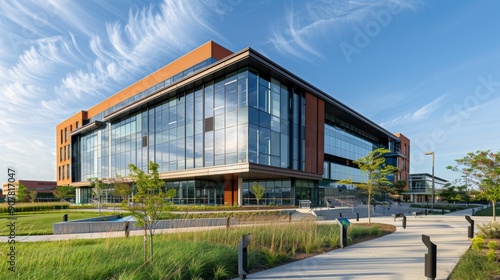 Fototapeta premium Modern Office Building with Blue Sky and Cirrus Clouds.