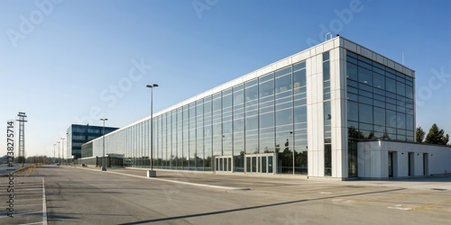 Obraz premium Modern office building with glass fa?ade under a clear blue sky, modern building, interior design, concrete
