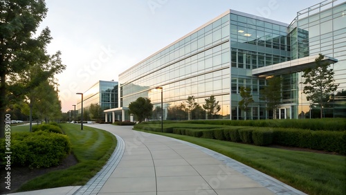 Fototapeta premium Modern Office Building with Glass Facade and Landscaped Walkway in Business...