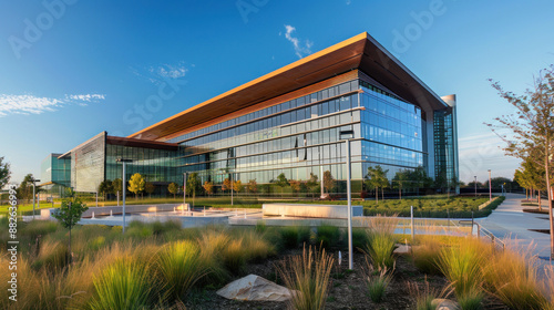 © SebuahKisah, Fototapeta premium Modern office building with landscaped grounds.