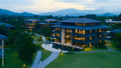 Naklejka premium Modern office buildings complex at twilight, nestled in a tranquil landscape. Aerial view showcasing architectural design, spacious grounds, and serene ambiance. Ideal for commercial property showcase