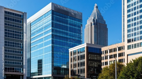 Naklejka premium Modern office buildings in city skyline; urban landscape; sunny day; business district; possible use for stock photo