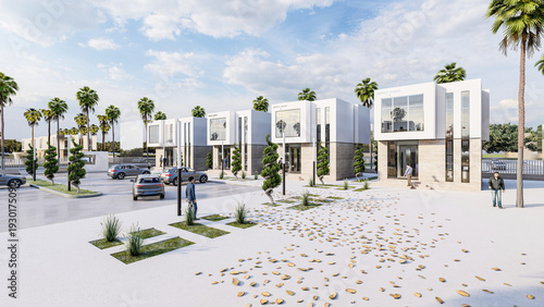 © Abbes, Fototapeta premium Modern Office Complex with Parking and Palm Trees – Contemporary 3D Architectural Rendering