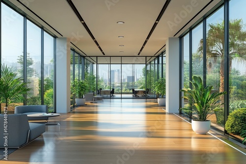 Fototapeta premium Modern office corridor with panoramic city views.