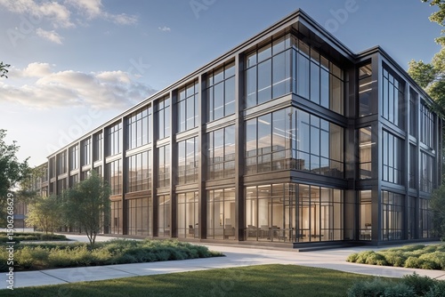 Fototapeta premium Modern Office Designs with Expansive Windows and Distinctive Facades