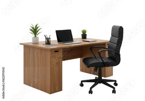 © TURTLE-STUDIO, Fototapeta premium Modern Office Desk with Chair and Plants – Professional Workspace PNG