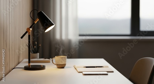 Fototapeta premium Modern office desk with lamp and coffee